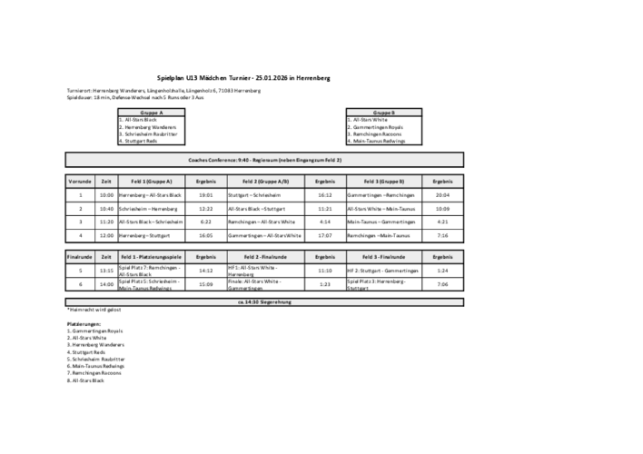 Als einziges Team ungeschlagen blieben die Gammertingen Royals mit 5 Siegen. Das All-Star White Team wurde 2., dicht gefolgt von den Gastgebern Herrenberg Wanderers, die das Halbfinale mit einem Punkt gegen die All-Stars White verloren hatten. Vierter wurden die Reds, die sich super steigerten. Platz 5 ging an die Raubritter aus Schriesheim, die die Main-Taunus Redwings auf den 6. Platz verwiesen. 7. wurden die Remchingen Racoons mit einem knappen Sieg über die All-Stars Black, die gleich drei Vereine repräsentieren.