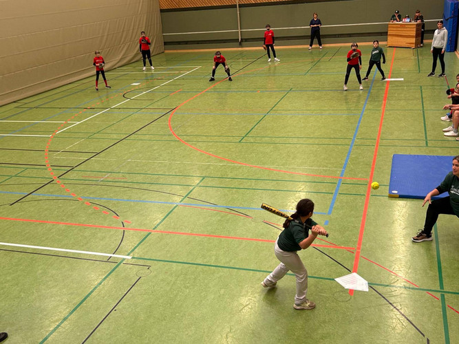 Wie beim Hallenbaseball üblich, wird der Ball seitlich getosst und dann möglichst unfangbar an den 6 Defensivspielerinnen vorbei geschlagen. Durch das kleinere Feld auf 1/3 der Halle geht es schnell zu, denn die Entfernungen der Bases, die umrundet werden müssen betragen gerade mal 12x9 Meter. Dadurch, dass spätestens nach 5 Punkten gewechselt wird gibt es viele „fliegende Wechsel“ der Teams, die zwischen Offensive und Defensive wechseln. Im Schnitt ist jede Spielerin in den 18 min Spielzeit 4-5x am Schlag, dh es ist ganz schön viel los auf dem kleinen Spielfeld, auf dem ca. 30 Punkte je Spiel erzielt werden.